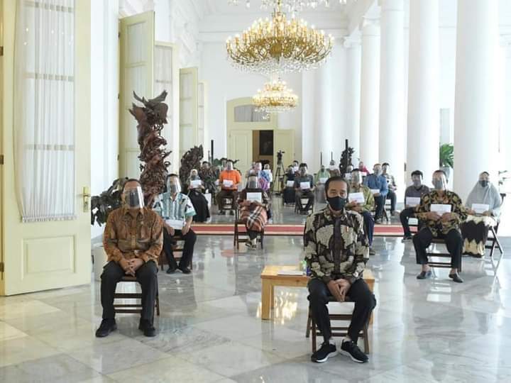 Kali ini bantuan diberikan kepada 50 orang pelaku UMK dari sejumlah wilayah Kota dan Kabupaten Bogor, yang hadir dalam dua sesi terpisah dengan tetap menerapkan protokol kesehatan ketat di Halaman Depan Istana Kepresidenan Bogor, Jawa Barat.
