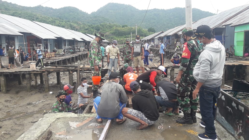 Antusiasme dan kebersamaan anggota Kodim 1628/SB, anggota Koramil Taliwang, anggota Polsek Taliwang , anggota Kompi Brimob, segenap komponen masyarakat gotong-royong memperbaiki jalan rumah apung dusun Wara B labuhan Lalar, di pimpin Pasi Ter Kodim 1628/SB Kapten Cba Agus.