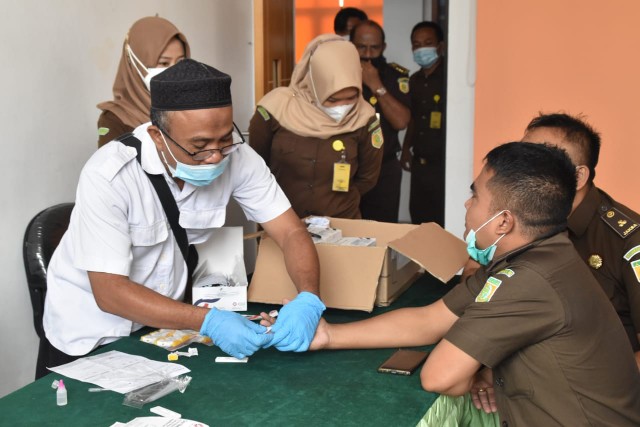 Dijelaskan, kegiatan rapid test untuk ketiga kalinya ini dilaksanakan dengan mengambil sample darah terhadap warga Adhyaksa Kejari Sumbawa itu dilakukan pada pukul 10.15 Wita oleh petugas kesehatan Agus Salim Amd Staf Laboratorium RSUD Sumbawa, dengan hasil rapid test bersama itu seluruh peserta yang ikut hanya 1 orang yang dinyatakan reaktif dan yang bersangkutan selanjutnya dilakukan swab rapid antigen pada Kamis 4 Februari 2021 di RSUD Sumbawa.