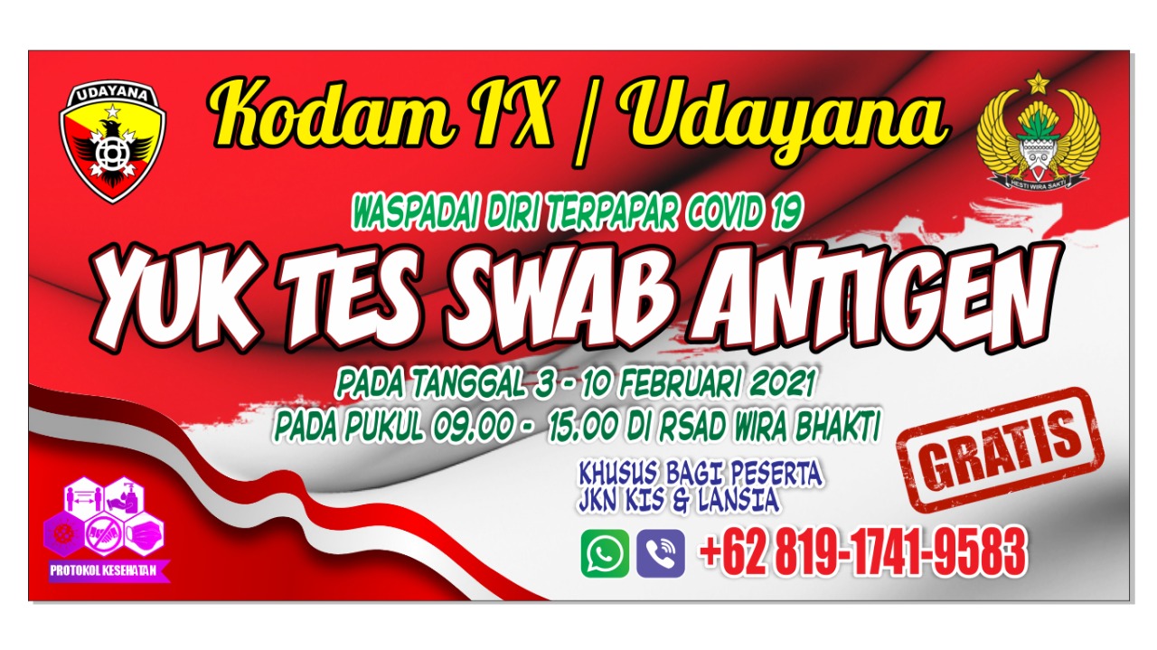 Kabar gembira untuk masyarakat. Rumah Sakit Angkatan Darat (RSAD) Wira Bhakti Mataram menggelar tes swab antigen (rapid antigen) secara gratis. Tes swab antigen ini diperuntukan bagi masyarakat umum. Kegiatan yang digelar oleh TNI ini hanya terselenggara selama satu pekan saja. Terhitung mulai 3 hingga 10 Februari 2021.