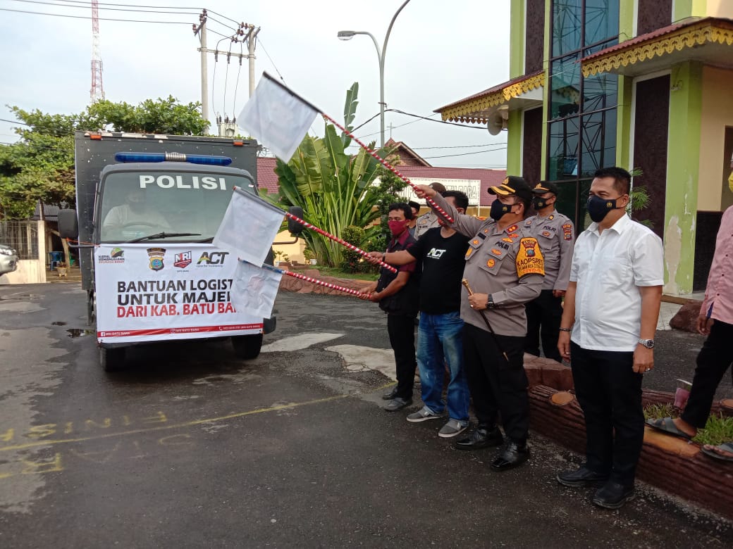 Bantuan yang digalang MRI dilepas AKBP Ikhwan Lubis didampingi Kasat Reskrim AKP Fery Kusnadi, Kasubbag Sarpras AKP Syahrial dan Ketua MRI Batu Bara Fazzary Akhbar Tanjung di halaman Mapolres Batu Bara, Senin (08/02/2021) petang.