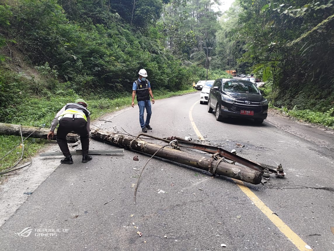 Simalungun,|infoaktualnews.com,- Kanit Lantas Polsek Parapat Polres Simalungun Ipda Hendri Koto bersama Briptu Anwar Giting (Banit Lantas) langsung mendatangi Tempat Kejadian terjadinya Tiang Listrik yang tumbang dan Pohon tumbang di Aek Nauli Desa Tanjung Dolok Kecamatan Girsang Sipangan Bolon Kabupaten Simalungun, Jumat(12/02), sekira Pkl.10.00 Wib.