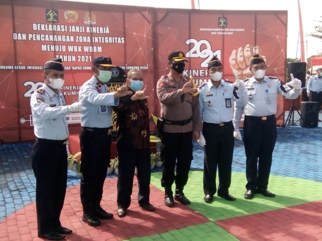Bertempat dihalaman upacara Balai Pemasyarakatan (Bapas) Sumbawa Kamis (18/9) jajaran Kemenkum HAM Provinsi NTB unit kerja satuan kerja (Satker) Pemasyarakatan dan Imigrasi melaksanakan Deklarasi Kinerja dan Pencanangan Zona Integritas menuju Wilayah Bebas Korupsi Wilayah Birokrasi Bersih Melayani (WBK-WBBM) Tahun 2021 sekaligus pengukuhan kesatuan operasional internal pemasyarakatan se Kabupaten Sumbawa.