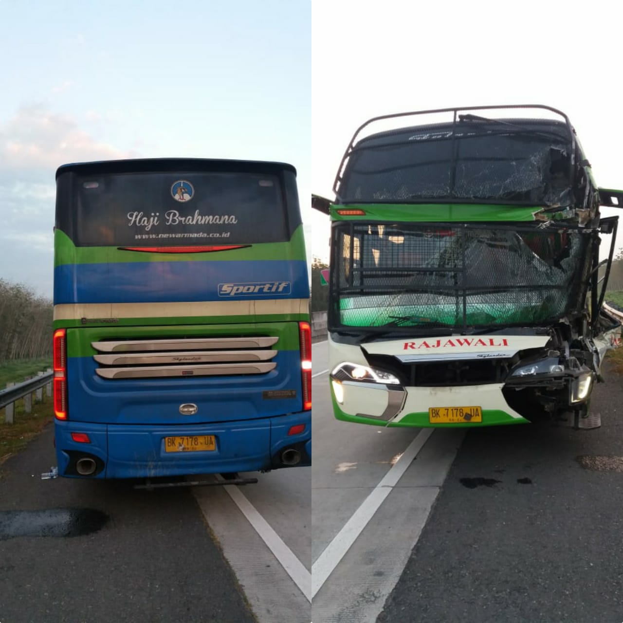 Serdang Bedagai – Bus Rajawali Nopol BK 7178 UA seruduk truk Colt Disel Nopol BK 9703 BF, di jalan Tol jalur B Tebing Tinggi menuju arah Medan tepatnya di KM. 64-500 Areal perkebunan sawit Desa Sei Buluh, Kec. Perbaungan, Kab. Serdang Bedagai, Rabu (17/2/2021) sekira pukul 06.15 WIB.