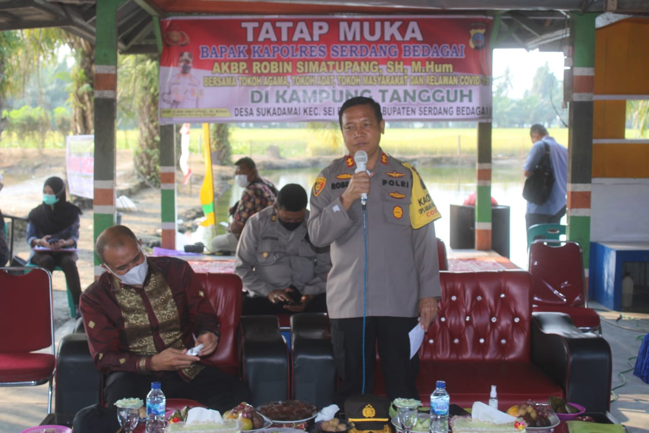 Serdang Bedagai,| Infoaktualnews.com,- Kapolres Serdang Bedagai AKBP Robin Simatupang SH MHum meresmikan Kampung Bertuah dan melakukan sosialisasi kepada tokoh masyarakat tentang penerapan PPKM skala mikro di Desa Suka Damai Kecamatan Sei Bamban, Kamis (18/2/2021) sore di halaman rumah Kepala Desa Suka Damai.