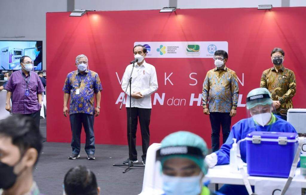 Presiden Joko Widodo meninjau pelaksanaan vaksinasi massal yang khusus diperuntukkan bagi para wartawan dan dimulai dari wilayah DKI Jakarta. Vaksinasi tersebut dilaksanakan di Hall A Basket Gelora Bung Karno, Senayan, Jakarta, pada Kamis, (25/2).