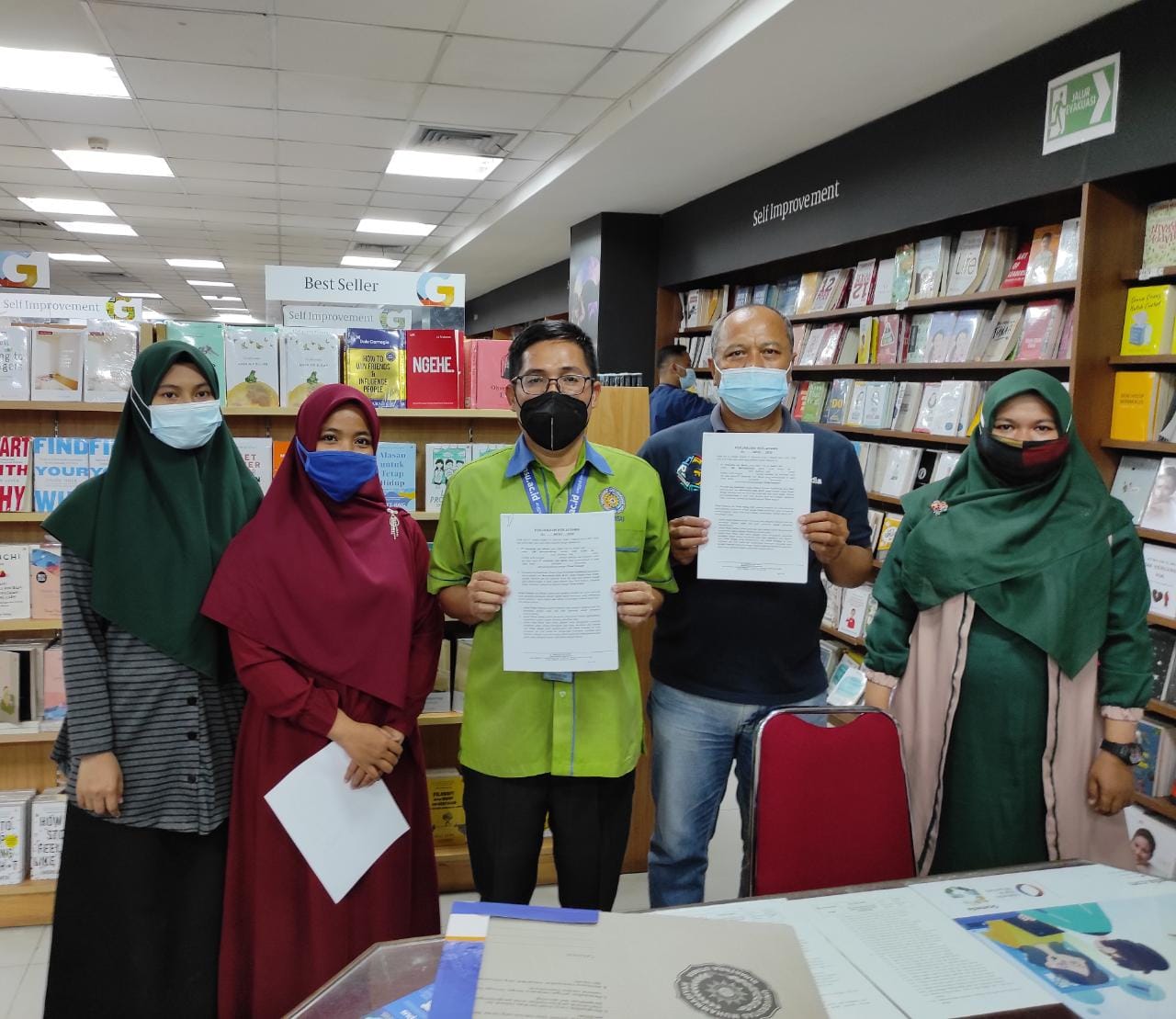 MoU ditandatangai Kepala UMSU Press, Muhammad Arifin, MPd dan Merchandising Local Books Manager, Wagimin didampingi unsur Staf UMSU Press, Nadra Amalia, MPd (Bagian Distribusi dan Pemasaran UMSU Press) Rabu 10/03 di Gramedia Jln Gajah Mada Medan.