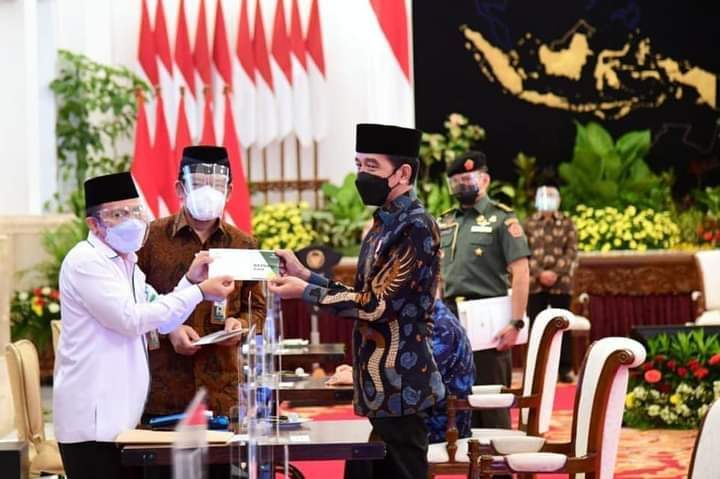 Presiden Joko Widodo menyerahkan zakat kepada Badan Amil Zakat Nasional (Baznas) di Istana Negara, Jakarta. Acara tersebut digelar dengan tetap mematuhi dan menjaga protokol kesehatan yang ketat. Kamis (15/4).