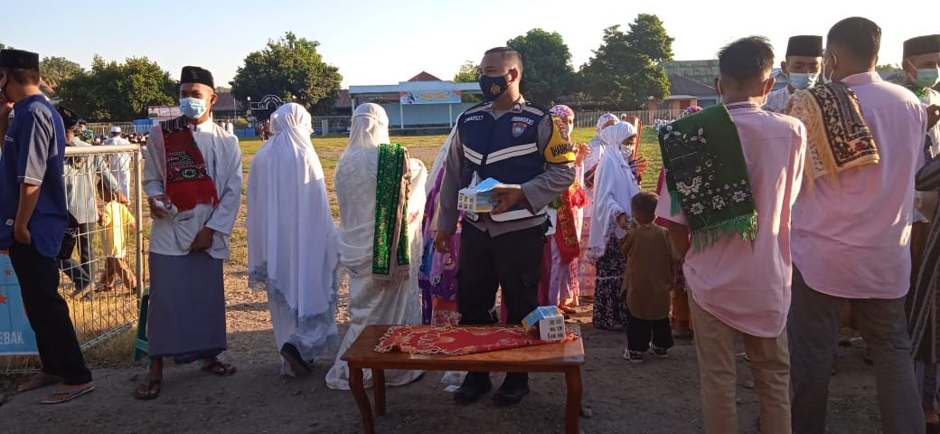 ” Disamping itu melaksanakan pengamanan kami juga membagikan masker kepada para jamaah yang akan melaksanakan Sholat Idul Fitri”, imbuhnya