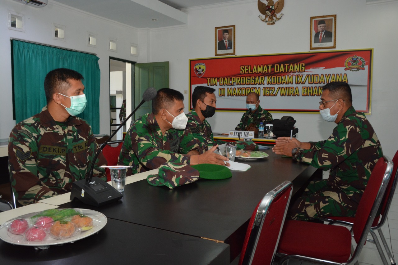 Tim Dalproggar dan Wasgiat Bin Sisfo Kodam IX/Udayana yang dipimpin Pabandya Analisa dan Evaluasi Dalprog Staf Perencanaan Kodam IX/Udayana Letkol Inf I Nyoman Mahayasa dan rombongan diterima Kasi Perencanaan Korem 162/WB Kolonel Arh Joko Purnomo bersama para Perwira Staf Korem 162/WB.