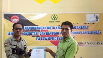 Oleh karena itu, Kamis (15/7), LKBH milik Fakultas Hukum IISBUD SAREA meresmikan kerjasamanya bersama FA LAW OFFICE SUMBAWA, bertempat di kampus IISBUD SAREA, ditandai dengan penandatangan Memorandum of Undestanding (MoU) yang dilaksanakan antara Advocat Febrian Anindita, SH mewakili FA LAW OFFICE dan Supriyadi, SH.I MH.I selaku Ketua LKBH IISBUD SAREA. Dengan pengesahan perjanjian ini juga disaksikan oleh Pejabat LPMI IISBUD SAREA Najamuddin, SPd MPd serta rekan-rekan dari FA LAW OFFICE secara garis besar kerjasama yang dirancang ini adalah kerjasama bidang hukum, perjanjian kerjasama mengenai bantuan advokasi hukum serta penyuluhan hukum kepada masyarakat.