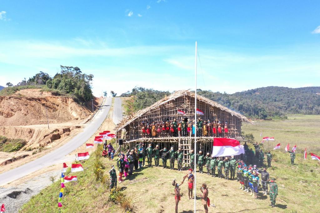 Usai upacara pengibaran bendera merah putih Pangdam berkesempatan memasuki rumah adat dan menerima penjelasan tentang rumah adat kaki seribu yang merupakan budaya masyarakat Pegaf.