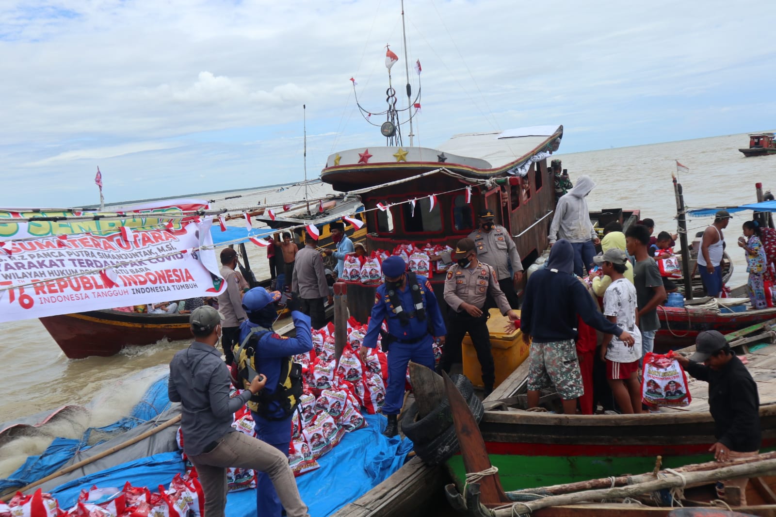 Batubara – INFOAKTUALNEWS.COM,. Polres Batubara bersama Komunitas Sedekah Jumat ( KSJ ) laksanakan pendistribusian bantuan sosial kepada masyarakat Pesisir dalam rangka Heri Kemerdekaan Republik Indonesia Ke 76, yang terdampak Covid 19, di pelabuhan Tanjung Tiram, Kecamatan Tanjung Tiram, kabupaten Batubara, Selasa (17/08/2021).