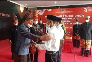 SUMBAWA, Infoaktualnews.com – Bupati Sumbawa, H. Mahmud Abdullah Selasa, (17/8) didampingi Kalapas Sumbawa Besar, M. Fadli menyerahkan Surat Keputusan Pemberian Remisi Umum secara simbolis kepada dua orang perwakilan warga binaan Lapas Sumbawa Besar. Kegiatan tersebut berlangsung di Kantor Bupati Sumbawa dengan panduan dari Direktorat Jenderal Pemasyarakatan secara virtual.
