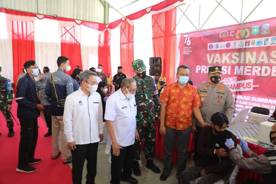 SUMBAWA, Infoaktualnews.com – Bupati Sumbawa, Drs. H. Mahmud Abdullah mendampingi Gubernur NTB, Kapolda NTB serta Danrem 162/WB meninjau pelaksanaan Vaksinasi Presisi Merdeka Goes to Campus yang dilaksanakan di Universitas Teknologi Sumbawa pada Kamis, 19 Agustus 2021.