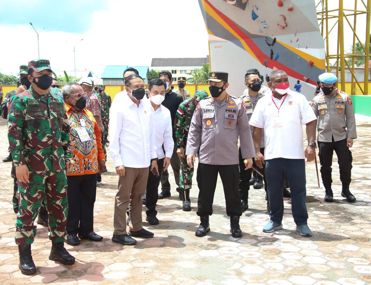 Panglima TNI Marsekal Hadi Tjahjanto, Kapolri Jenderal Listyo Sigit Prabowo dan Menpora Zainudin Amali melakukan peninjauan venue pertandingan panjat tebing dan biliar PON ke-XX di Kabupaten Mimika, Papua, Sabtu (28/8/2021).l