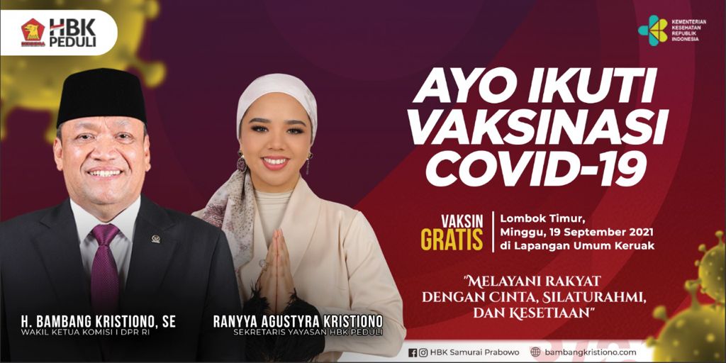 Anggota DPR RI dari Dapil NTB 2/Pulau Lombok, H. Bambang Kristiono, SE (HBK) melalui Yayasan miliknya HBK PEDULI, akan menggelar vaksinasi masal gratis bagi 5.000 warga di 5 Kabupaten/Kota di Pulau Lombok. Vaksinasi ini bagian dari ikhtiar dan perjuangan HBK untuk memberi pelayanan dan jaminan kesehatan bagi warga Pulau Seribu Masjid.