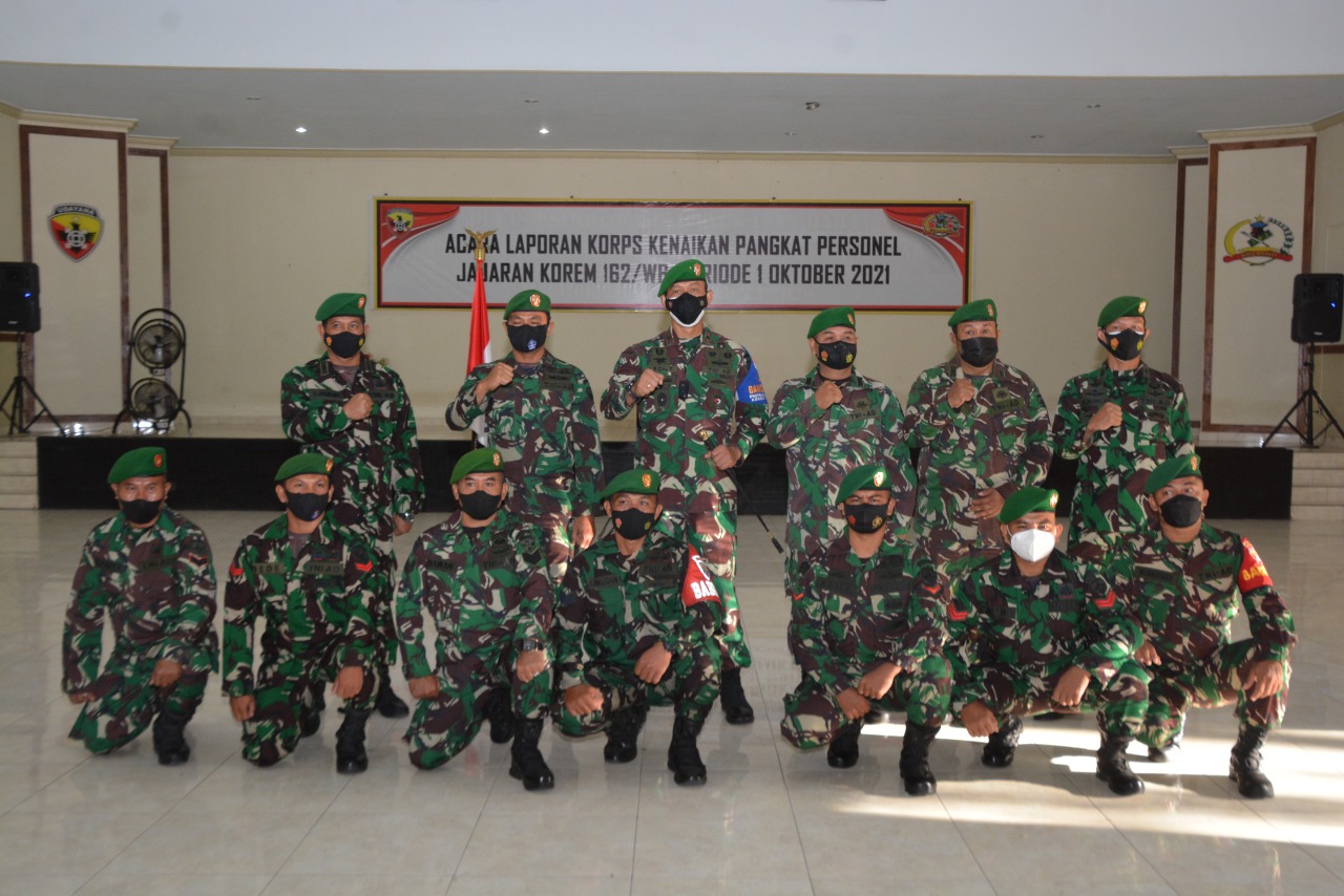 Korem 162/WB – infoaktualnews.com. Komandan Korem 162/WB Brigjen TNI Ahmad Rizal Ramdhani, S.Sos. SH. M.Han. memimpin Laporan Korp kenaikan pangkat Pamen (Perwira Menengah), Pama (Perwira Pertama), Bintara, Tamtama dan PNS Jajaran Korem 162/WB di Gedung Soedirman Makorem jalan Lingkar Selatan Kota Mataram, Jum’at (1/10/2021).