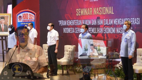Jakarta, Infoaktualnews – Kementerian Hukum dan HAM menyelenggarakan Seminar Nasional “Peran Kementerian Hukum dan HAM dalam Mengakselerasi Indonesia Sehat dan Pemulihan Ekonomi Nasional” dalam rangka Hari Dharma Karya Dhika Tahun 2021. Seminar Nasional ini dilaksanakan secara hybrid, luring di Graha Pengayoman Kementerian Hukum dan HAM serta daring melalui zoom dan youtube mengundang seluruh elemen masyarakat agar dapat berperan aktif ikut serta membangun Indonesia yang lebih baik.