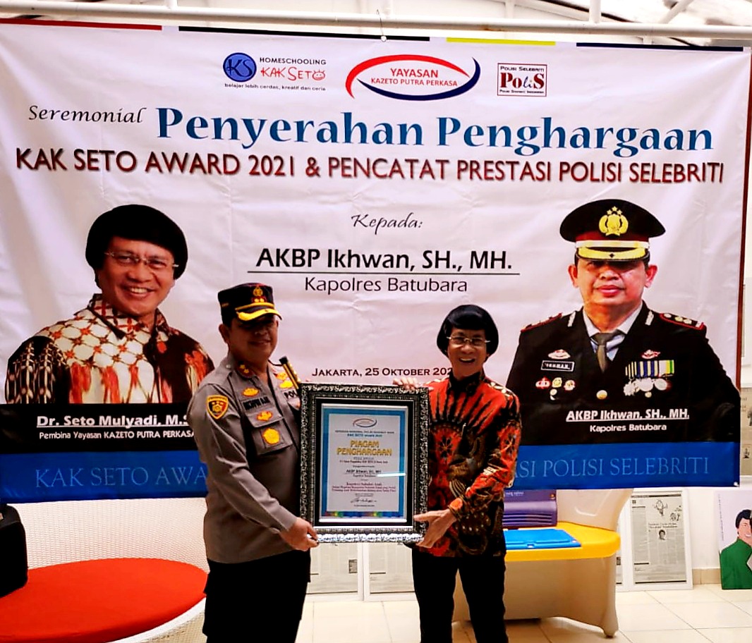 Jakarta | 25-10-2021,_ Kapolres Batu Bara AKBP Ikhwan Lubis SH, MH yang dinobatkan pemuka masyarakat Saharudin dan sejumlah ulama serta pemuda di Belawan sebagai Kapolres Pejuang Duafa, sejak 16 Agustus 2019 yang lalu, Senin 25/10 menerima penghargaan Kak Seto Award 2021 dan Pencatat Prestasi Polisi Selebriti, di Ruang Pendidikan Kak Seto Taman Cirendeu Permai, Jakarta Selatan.