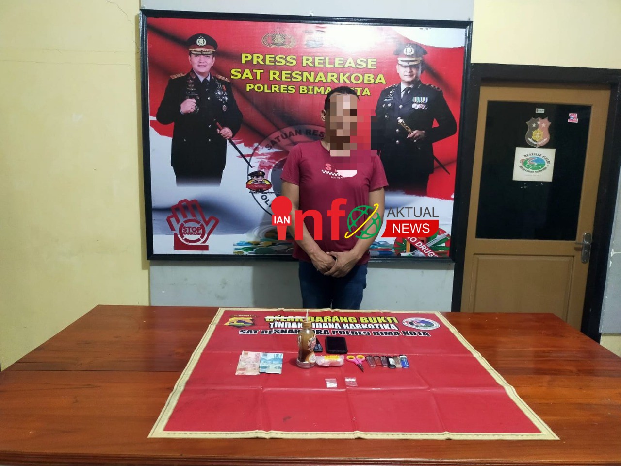AW(37) terciduk di kos-kosan seputaran Kelurahan Santi Kecamatan Mpunda Kota Bima bersama barang bukti, 1 lembar plastik klip berisi serbuk kristal diduga Shabu dengan berat kotor seberat 0,36 gram dan berat bersih seberat 0,15 gram. Barang bukti lain yang ikutbdiamankan antara lain barang yang ada kaitan dengan narkoba yakni 2 buah handphone, 5 korek gas, selembar klip kosong, gunting dan uang sejuy Rp 800 ribu.