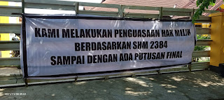 Puluhan massa menyegel dan menggembok pintu masuk sebelah barat Kantor Samsat dengan menempelkan Baliho Bertuliskan ” KAMI MELAKUKAN PENGUASAAN HAK MILIK BERDASARKAN SHM. 2384 SAMPAI DENGAN ADA PUTUSAN FINAL”.