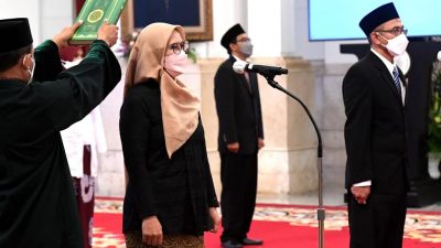 Acara pelantikan yang digelar dengan menerapkan protokol kesehatan secara ketat tersebut diakhiri dengan pemberian ucapan selamat dari Presiden Joko Widodo dan Wakil Presiden Ma’ruf Amin untuk kemudian diikuti oleh sejumlah tamu undangan terbatas lainnya.