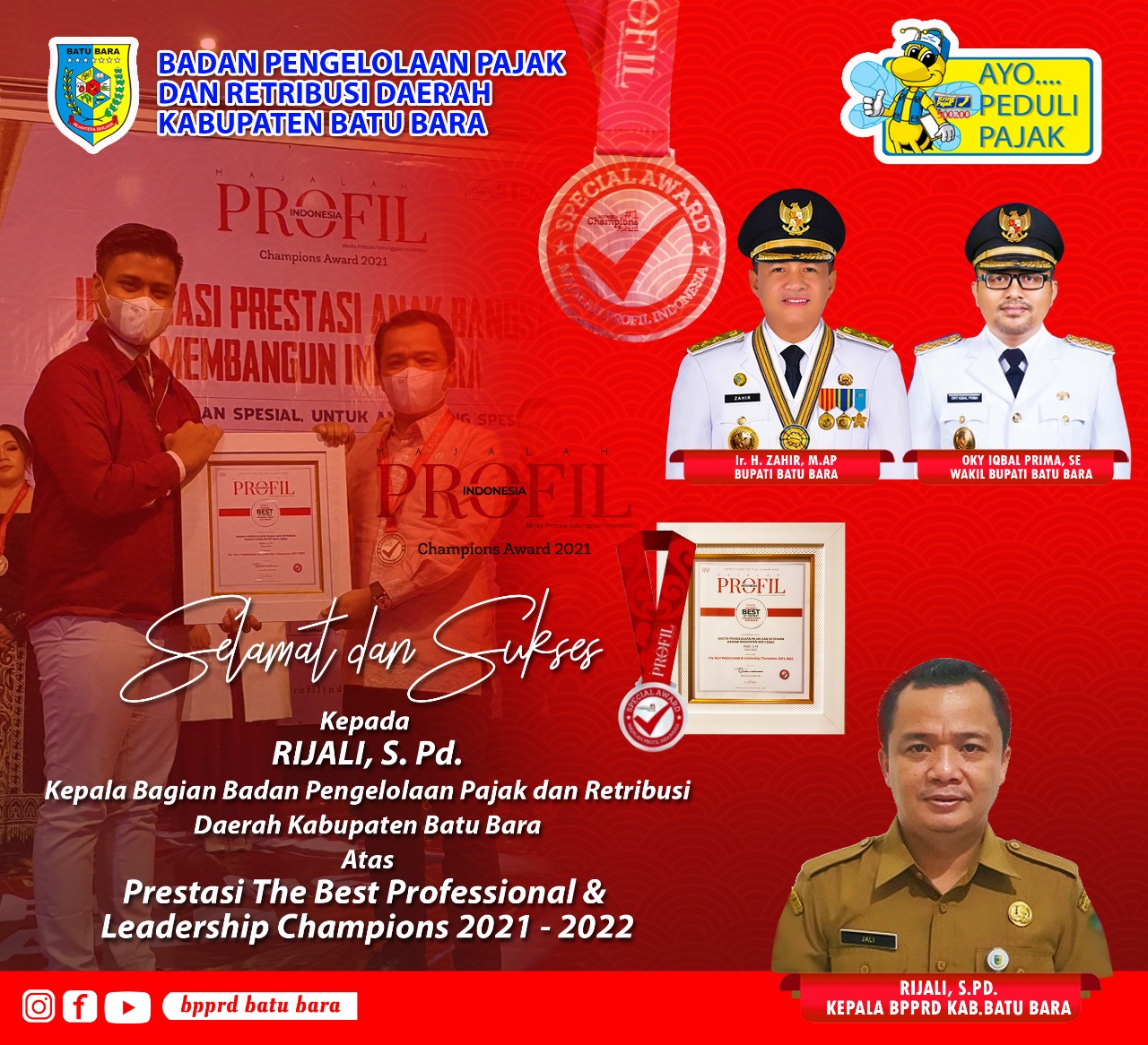 Batubara – INFOAKTUALNEWS.COM,. Ka BPPRD Batubara, Rijali meraih Prestasi The Best Profesional & Leadership Champion 2021-2022 Versi Majalah Profil Indonesia, Bali ,Jumat (3/12/2021)