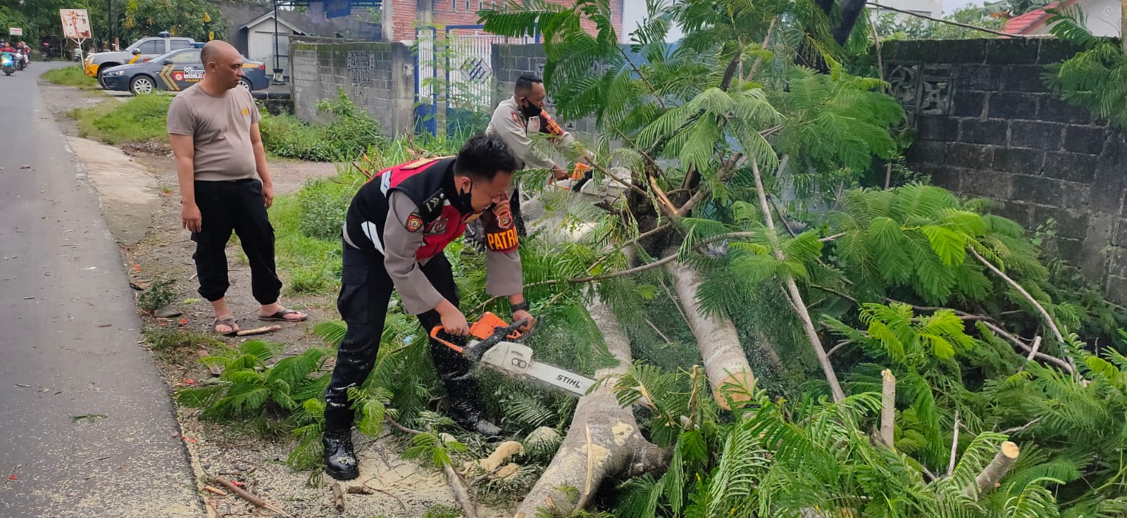 Kapolsek terjun langsung kelokasi pemotongan kayu di bantu oleh beberapa Anggota baik dari Polsek maupun dari Polres dengan menggunakan senso, di lanjutkan pembersihan terhadap kayu kayu yang sudah terpotong.