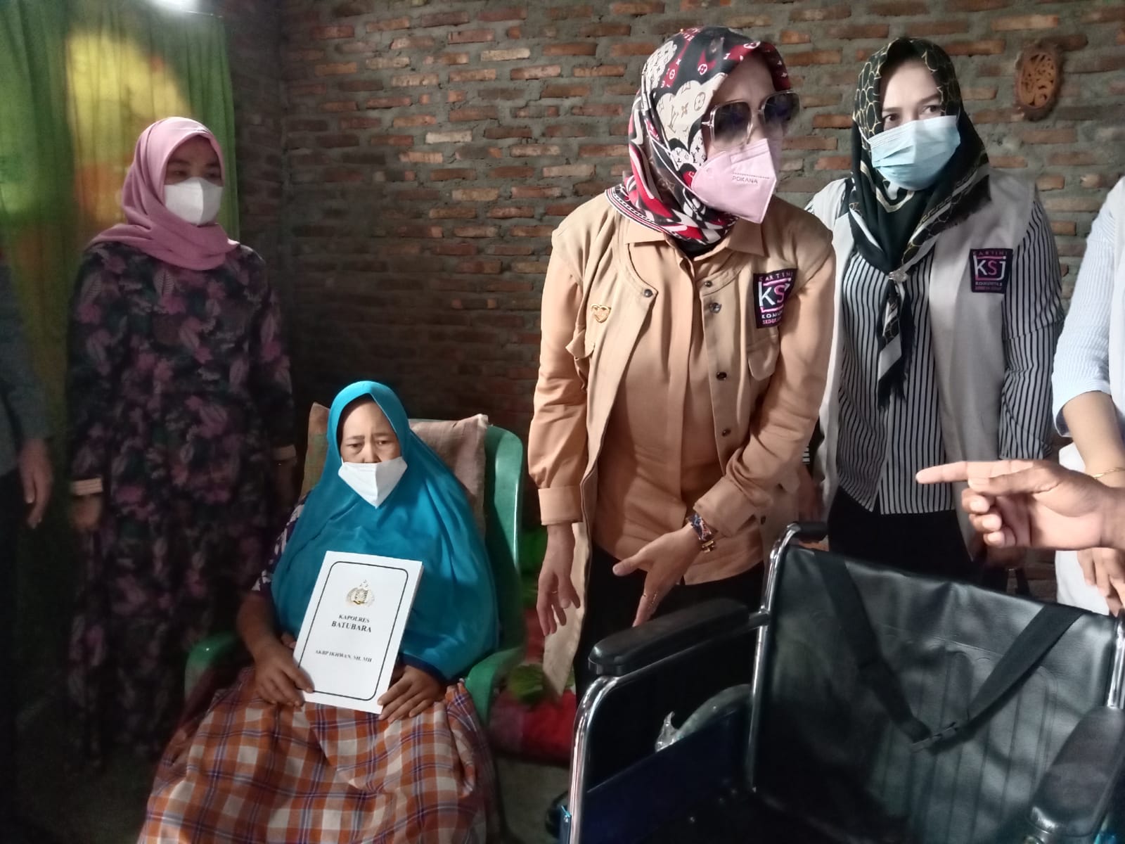 Batu Bara | Pengurus Kartini Komunitas Sedekah Jumat (KSJ) memberikan bantuan kursi roda kepada Ibu Dewi Hartati, warga Kelurahan Pagurawan, Kecamatan Medang Deras, Kabupaten Batubara, Sumatra Utara, Jumat (10/12/2021).