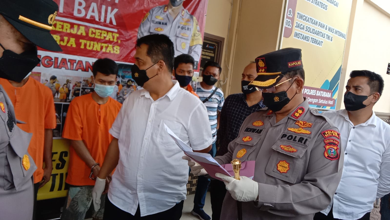 Ket photo : Kapolres Batu Bara AKBP Ikhwan Lubis didampingi Kasat Reskrim AKP Fery Kusnadi dan Kapolsek Lima Puluh AKP Rusdi merilis 4 kasus kriminal di Wilkum Polres Batu Bara, Senin siang,(13/12/2021).