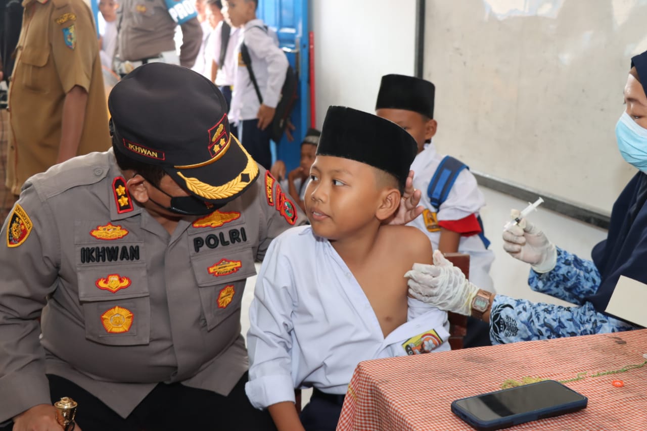 Kapolres Batubara AKBP Ikhwan Lubis monitoring kegiatan vaksinasi bagi anak Umur 6 -11 Tahun di sekolah Misuairiah, desa Binjai Baru kecamatan, Datuk tanah datar, dilanjutkan dengan melaksanakan monitoring di sekolah dasar SD Negeri 17 Titi Payung Kecamatan Air Putih, Batubara.