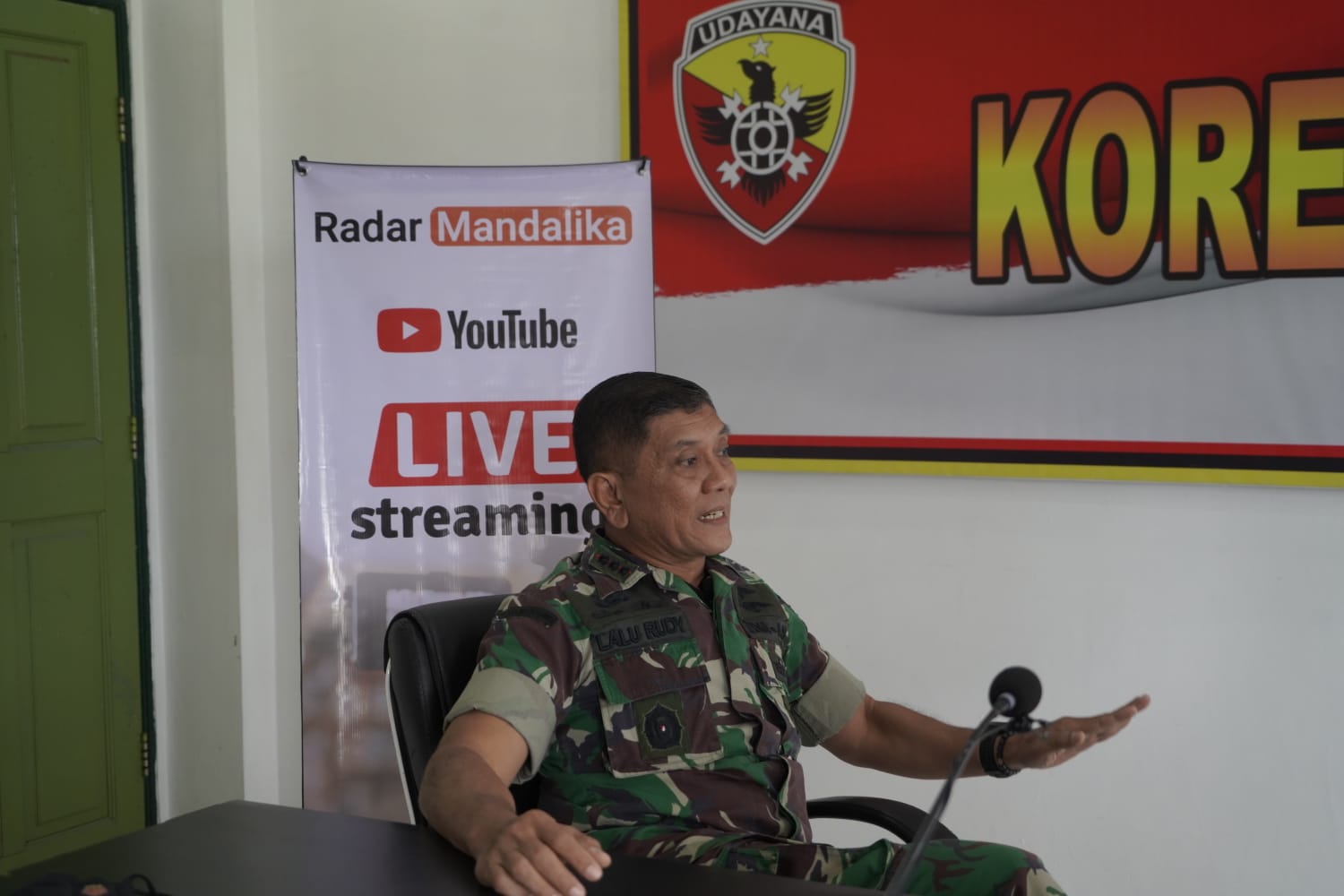 Danrem 162/WB Kolonel Czi Lalu Rudy Irham Srigede, ST. M.Si., ikuti wawancara eksklusif live streaming oleh Pimpinan Redaksi Radar Mandalika Diki Wahyudi di ruang rapat Makorem 162/WB jalan Lingkar Selatan Kota Mataram, Senin (17/1/2022).