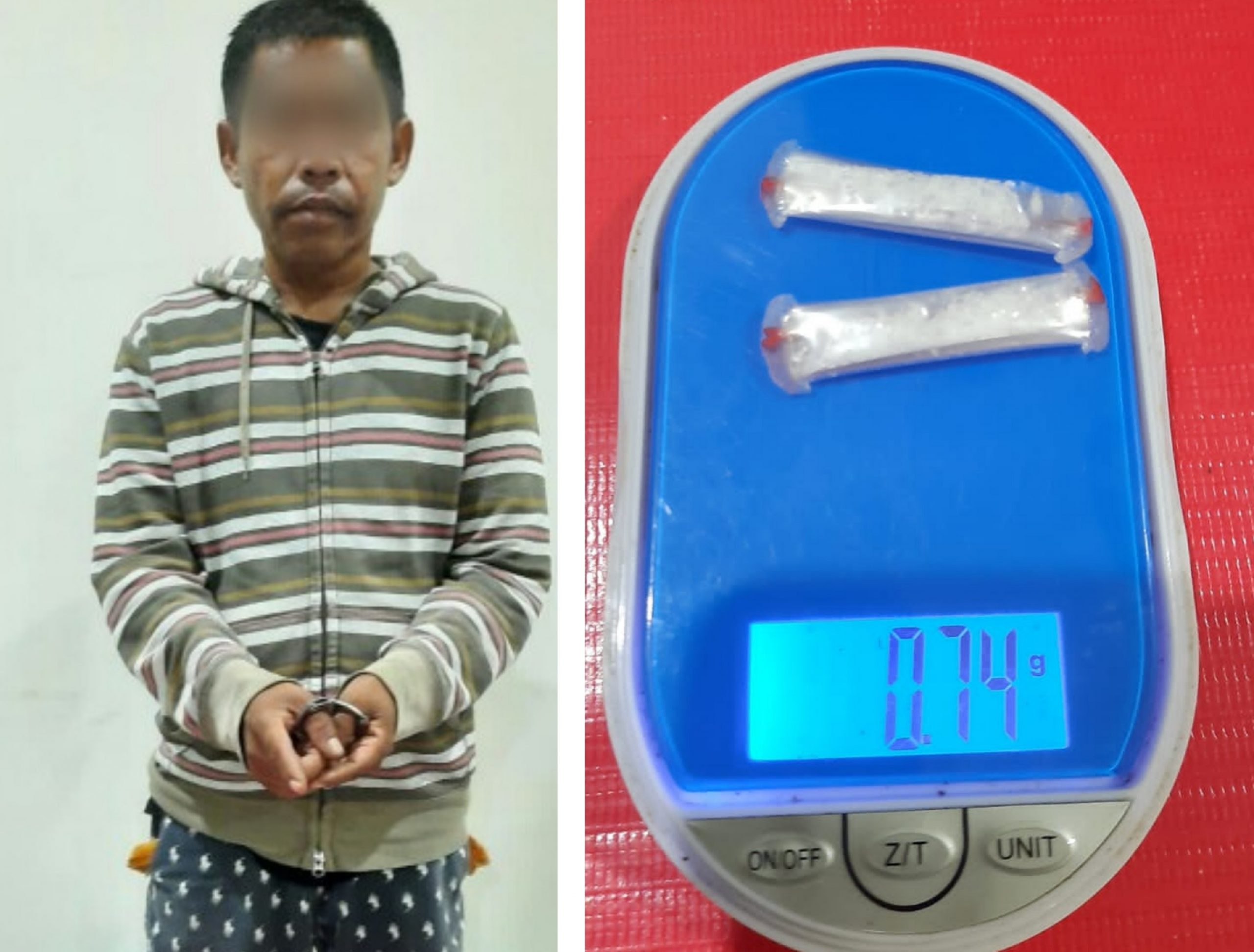 Adapun Barang Bukti yang berhasil diamankan yakni 2 poket ukuran kecil diduga narkotika jenis sabu dengan berat bruto 0,74 gram, 1 lembar tisu, 1 buah korek gas, 1 buah Hp Nokia warna hitam, dan 1 unit Sepeda Motor Supra Fit warna hitam tanpa No Pol