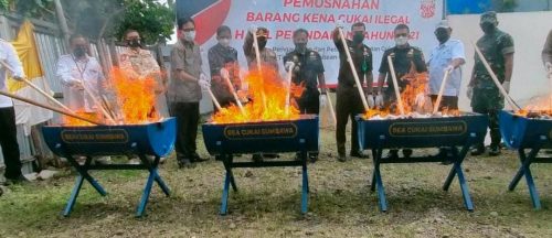Sumbawa, infoaktualnews.com – Pengawasan dan Pelayanan Bea dan Cukai (KPPBC) Tipe Madya Pabean C Sumbawa, menggelar acara Pemusnahan Barang Kena Cukai Ilegal Hasil Penindakan Tahun 2021, di Halaman Kantornya pada Kamis, (27/1).