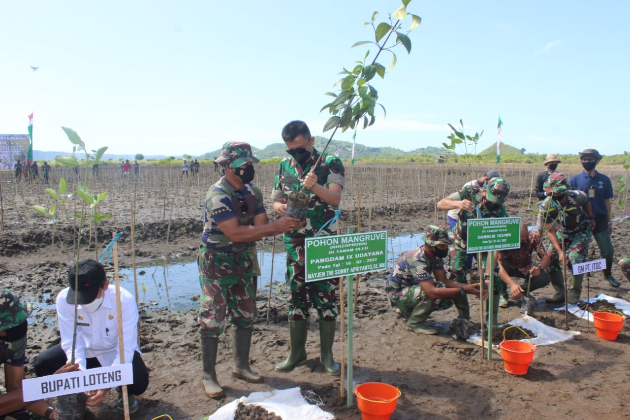 Setelah menerima paparan dari Kasiter Kasrem 162/WB Kolonel Inf Budi Rahmawan, Pangdam IX/Udayana bersama rombongan didampingi Danrem 162/WB, Forkopimda Loteng dan GM PT. ITDC melaksanakan penanaman secara simbolis bibit pohon mangrove di atas lahan seluas 11 hektar.