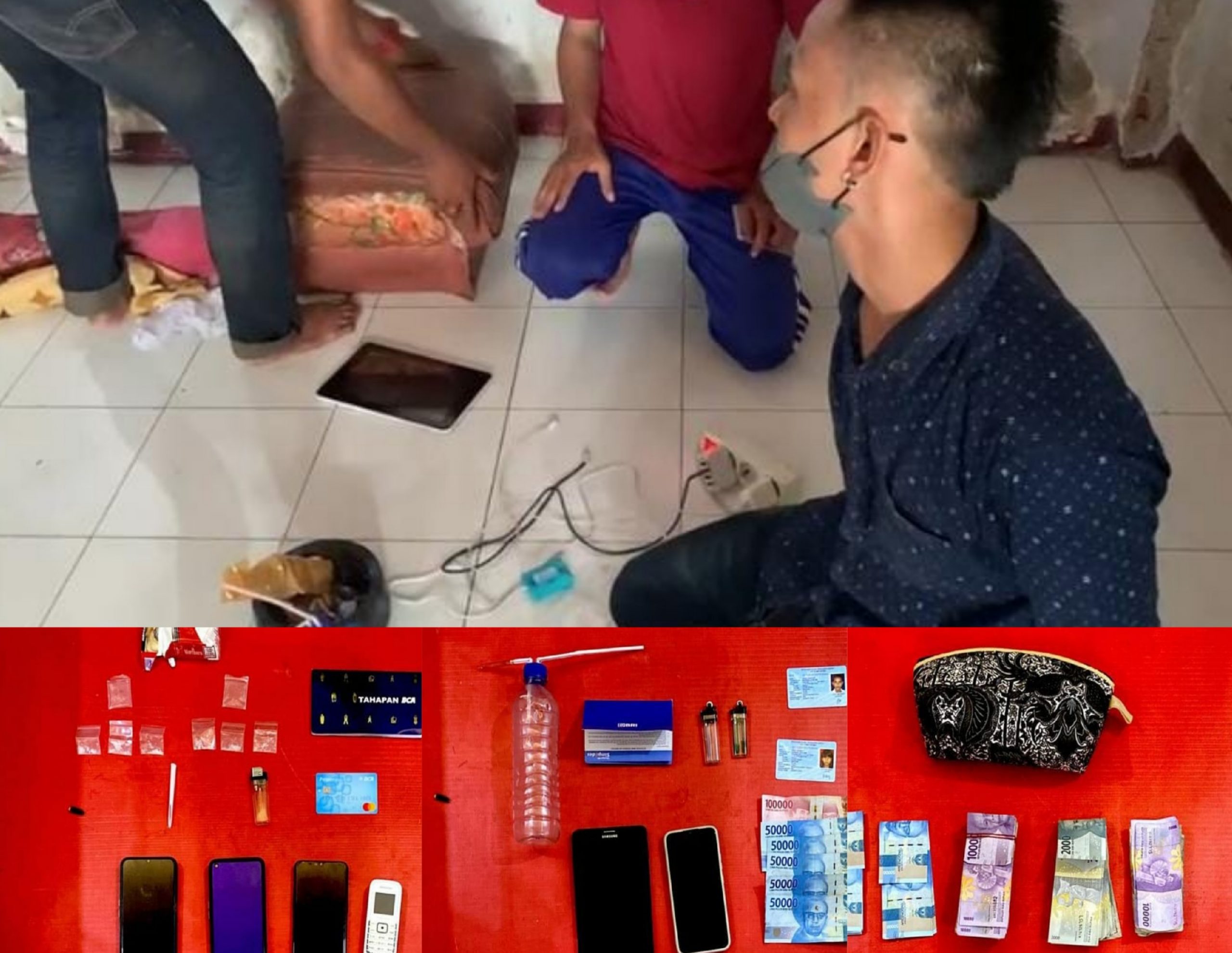 Barang Bukti shabu yang berhasil amankan sebanyak 5,25 gram Brutto, berikut alat konsumsi.dan uang tunai dan Hp milik para terduga pelaku tindak pidana Narkotika