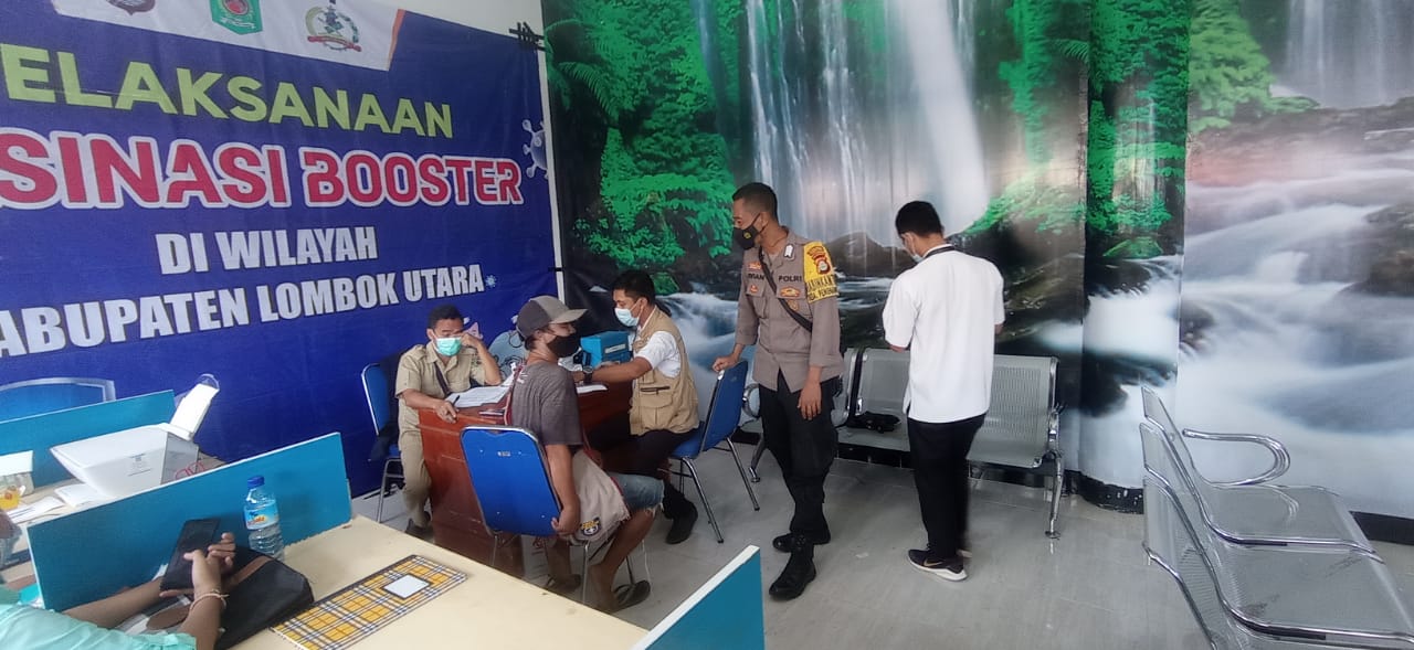 Polsek Pemenang Polres Lombok Utara melaksanakan pengamanan kegiatan vaksinasi serentak seluruh Indonesia yang dilaksanakan diruang tunggu pelabuhan bangsal Kecamatan Pemenang Kab. Lombok Utara (08/03/22)