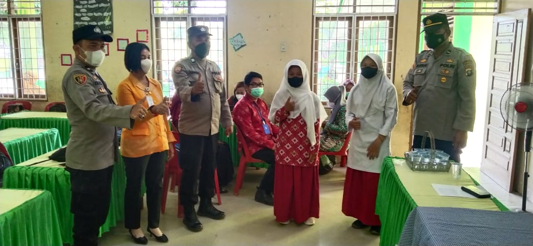 Personil Samapta Polsek Lima Puluh juga melaksanakan mobile untuk bantuan pengamanan/monitoring pelaksanaan vaksinasi yang diselenggarakan di Sekolah Min 1 Desa Perkebunan Kwala Gunung, Kecamatan Lima Puluh Pesisir, Kabupaten Batubara.