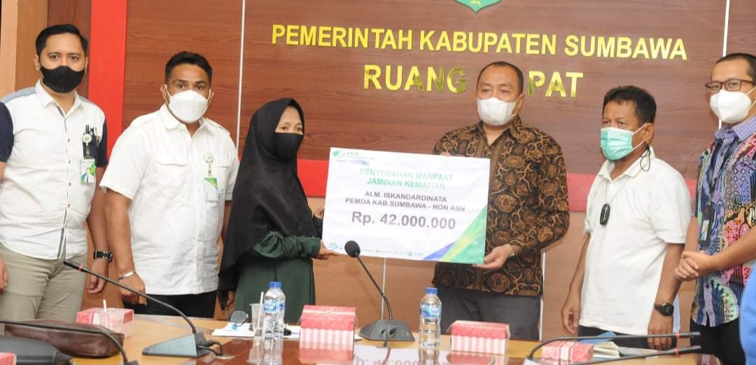 Dikesempatan ini pula, Ketua Dewan Pengawas berkenan menyerahkan langsung manfaat jaminan kematian dari BPJS Ketenagakerjaan untuk Alm. Iskandardinata Pegawai Non ASN Pemda Sumbawa, senilai Rp. 42.000.000,00. (IA-**)