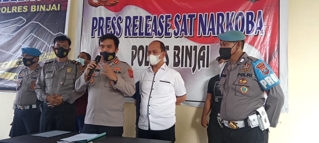 Binjai, Infoaktualnews.com | Press Release Pengungkapan Penangkapan Kasus Narkoba di salah satu warnet yang berada di jalan Gatot Subroto kelurahan Bandar Sinembah kecamatan Binjai Barat, Selasa (22/03) pukul 15.00 di halaman Mapolres Binjai.