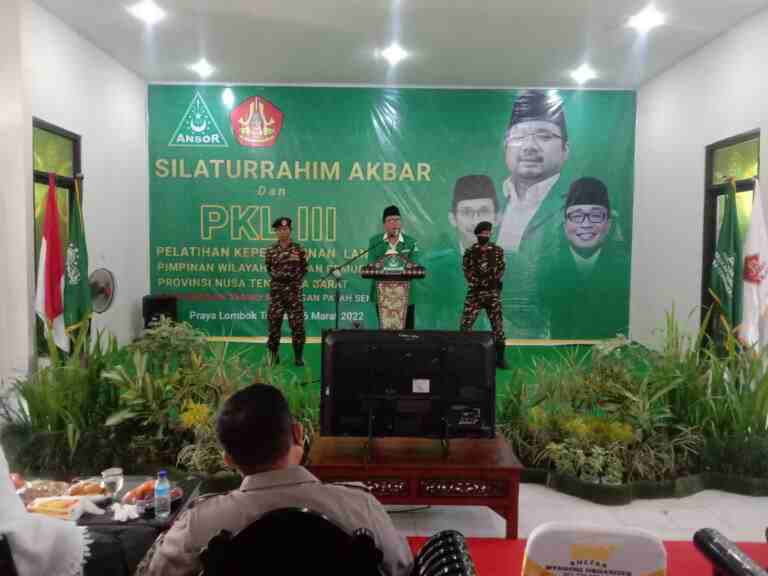 Lombok Tengah, infoaktualnews.com – Ketua umum PP GP Ansor/Menteri Agama RI Gus Yaculd cholil Qaumas buka secara virtual acara silaturrahmi akbar yang dirangkaikan dengan pembukaan Pelatihan Kepemimpinan Lanjutan (PKL) angkatan III, Gerakan Pemuda Anshor NTB. Pembukaan kegiatan dengan tema,”Satu Barisan Seribu Rintangan Patah Semua, bertempat Aula Kantor Kemenag Loteng, NTB, Sabtu (26/3).