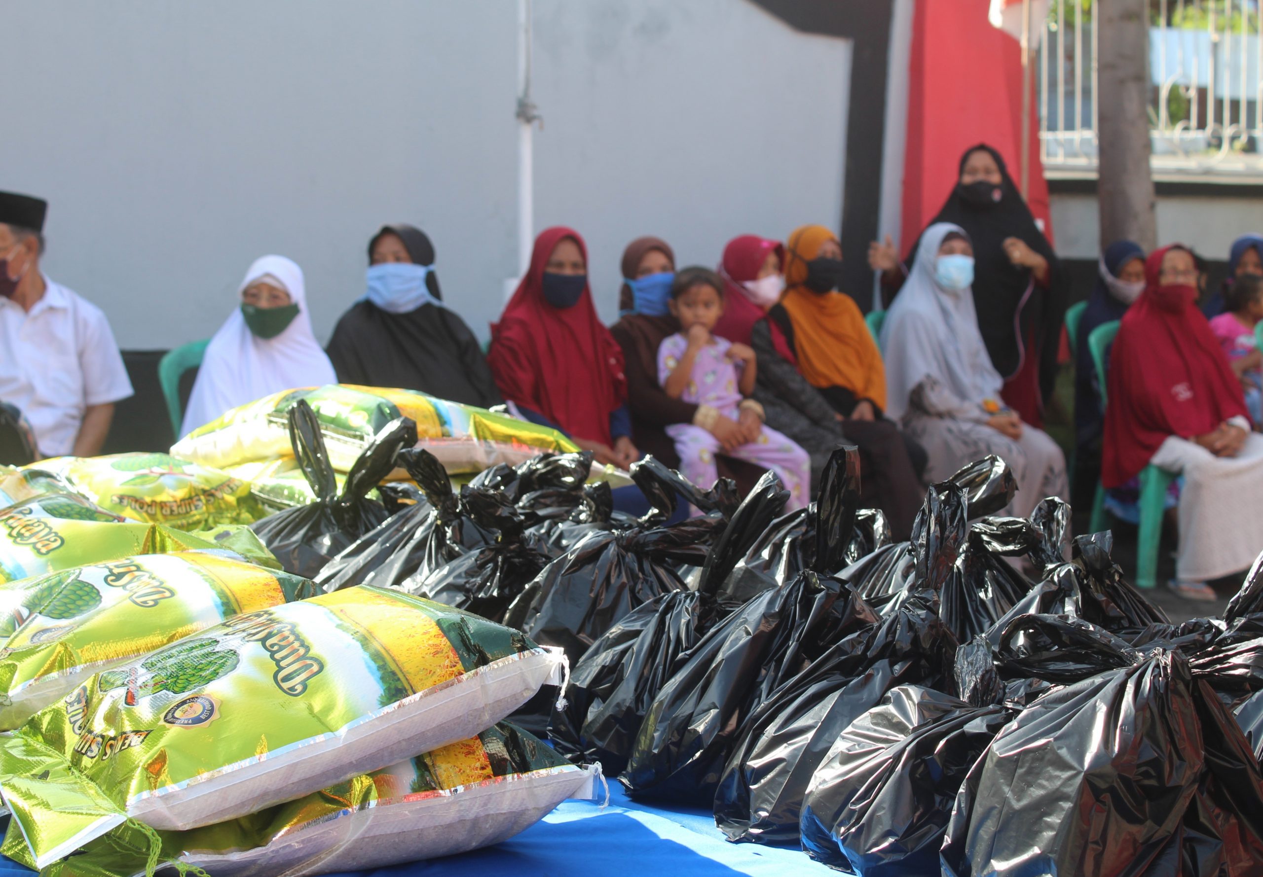Secara bergantian seluruh pejabat yang hadir menyerahkan paket bantuan secara simbolis kepada seluruh warga yang hadir. Panitia pelaksana kegiatan menyiapkan sekitar dua puluh paket sembako yang dibagikan kepada masyarakat kurang mampu, yang merupakan warga sekitar area kantor. Paket tersebut berisikan beras, mie instan dan telur.