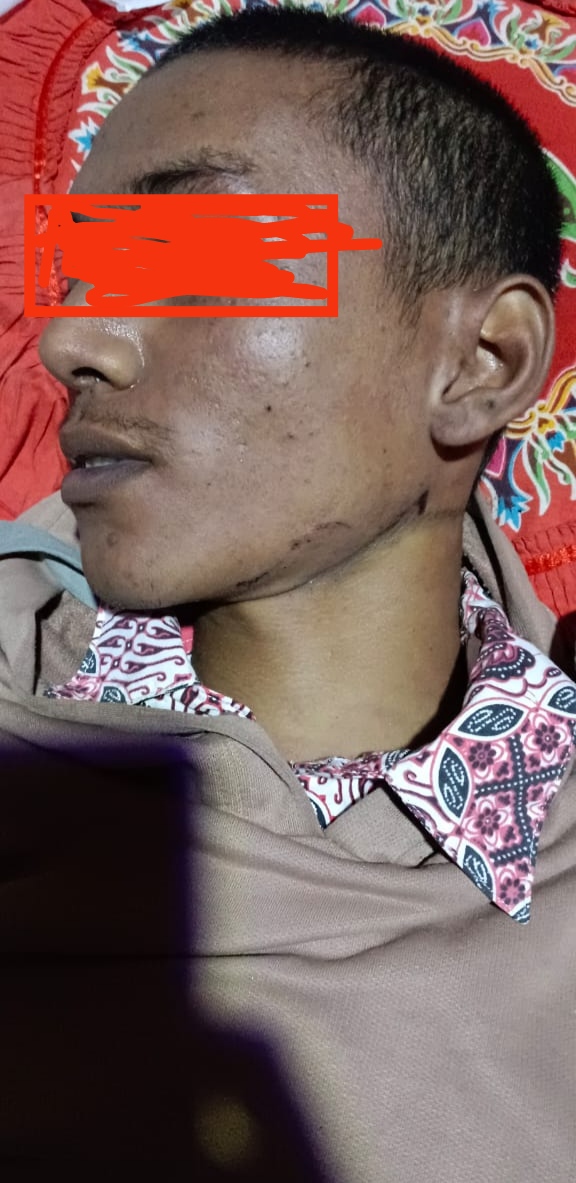 Korban ditemukan telah meninggal dunia, dengan posisi telentang di lantai rumah kosong, Korban menggunakan baju sekolah kemeja warna merah batik dan celana abu-abu.