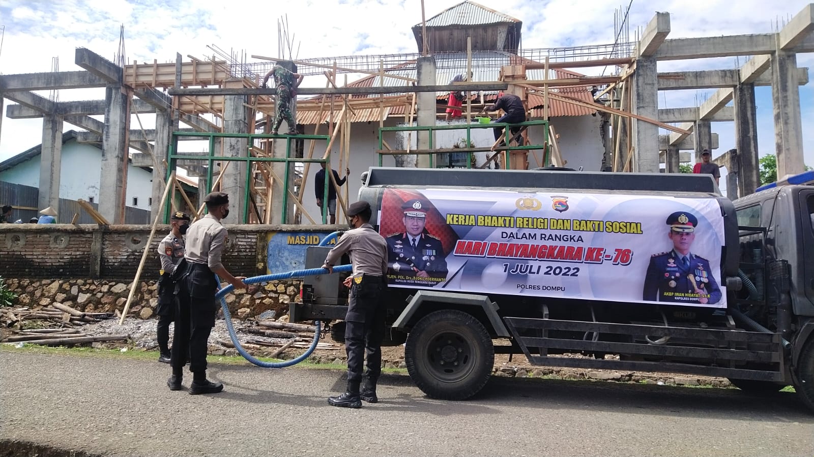 MATARAM ,infoaktualnews.com – Polres Dompu, Polda Nusa Tenggara Barat melalui personil Sat. Intelkam dan Sat Samapta Polres Dompu dalam rangka hari Bhayangkara Ke-76 kembali memberikan bantuan air bersih bertempat di Masjid Baburrahim, Dusun Rasanggaro, Desa Manggeasi, Kecamatan Dompu, Kabupaten Dompu (20/06/22) pukul 11.00 wita.