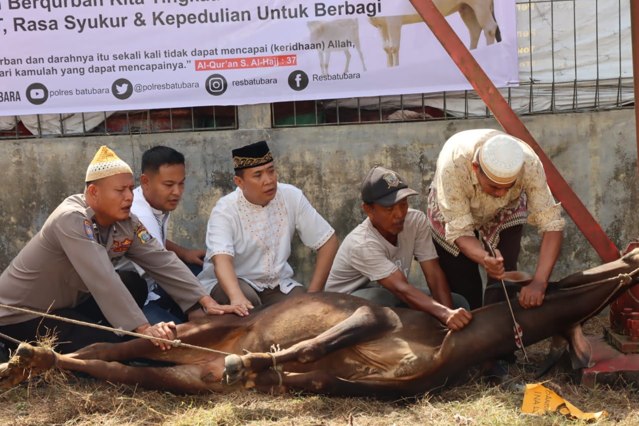 Batubara INFOAKTUALNEWS.COM – dalam rangka memperingati Hari Raya Idul Adha 1443 H Tahun 2022 Polres Batubara potong hewan Qurban sebanyak enam ekor lembu di Mako Polres Batubara, Minggu (10/07/2022).