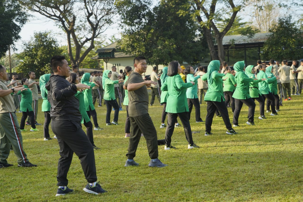 Dalam pelaksanaan olahraga bersama, Brigjen TNI Sudarwo Aris Nurcahyo, S.sos., M.M., didampingi Istri Ny. Asmeri Aris Nurcahyo selaku Ketua Korcabrem 162/WB bersama seluruh Prajurit dan Anggota PNS.