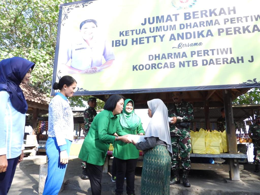Dalam kegiatan tersebut, Ny. Asmeri Aris Nurcahyo selaku Ketua Dharma Pertiwi Koorcab NTB Daerah J  beserta para pengurus turut serta dalam melaksanakan jumat berkah salurkan  Paket Bansos  berupa Nasi Box kepada warga Dhuafa  atau yang membutuhkan dilaksanakan di tiga Desa diantara tiga Kabupaten diantaranya seperti di Desa Kuranji Dalang, Kecamatan Labu Api, Kabupaten Lombok Barat, Kuta Mandalika, Kabupaten Lombok Tengah dan di Desa Rensing Kecamatan Sakra Barat Kabupaten Lombok Timur,” terang Ketua  Dharma Pertiwi Koorcab NTB.