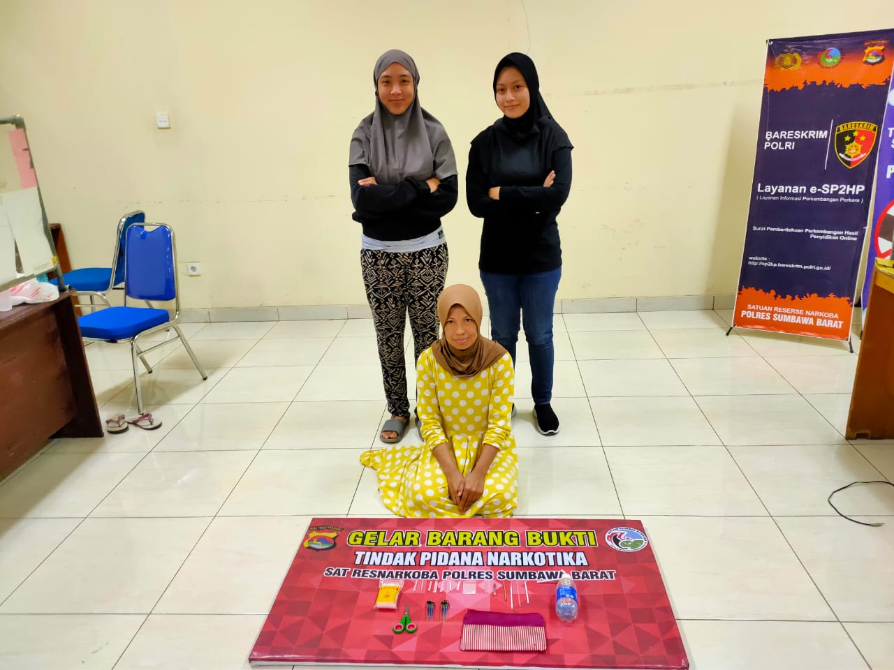Saat dilakukan penagkapan polisi berhasil sita barang bukti yang berhasil diamankan polisi nerupa 1 plastik klip berisi sabu dengan berat bruto 0,42 gram, 2 poket berisi sabu dengan berat bruto 0,70 gram, 1 pipet plastik ujungnya runcing, 1 jarum sumbu, 1 gunting, 1 bendel plastik klip kosong, 1 dompet warna merah garis putih, 1 bong terbuat dari botol pocary sweat, 2 pipa kaca, 2 pipet plastik, 2 korek api gas dan 5 poket kosong.