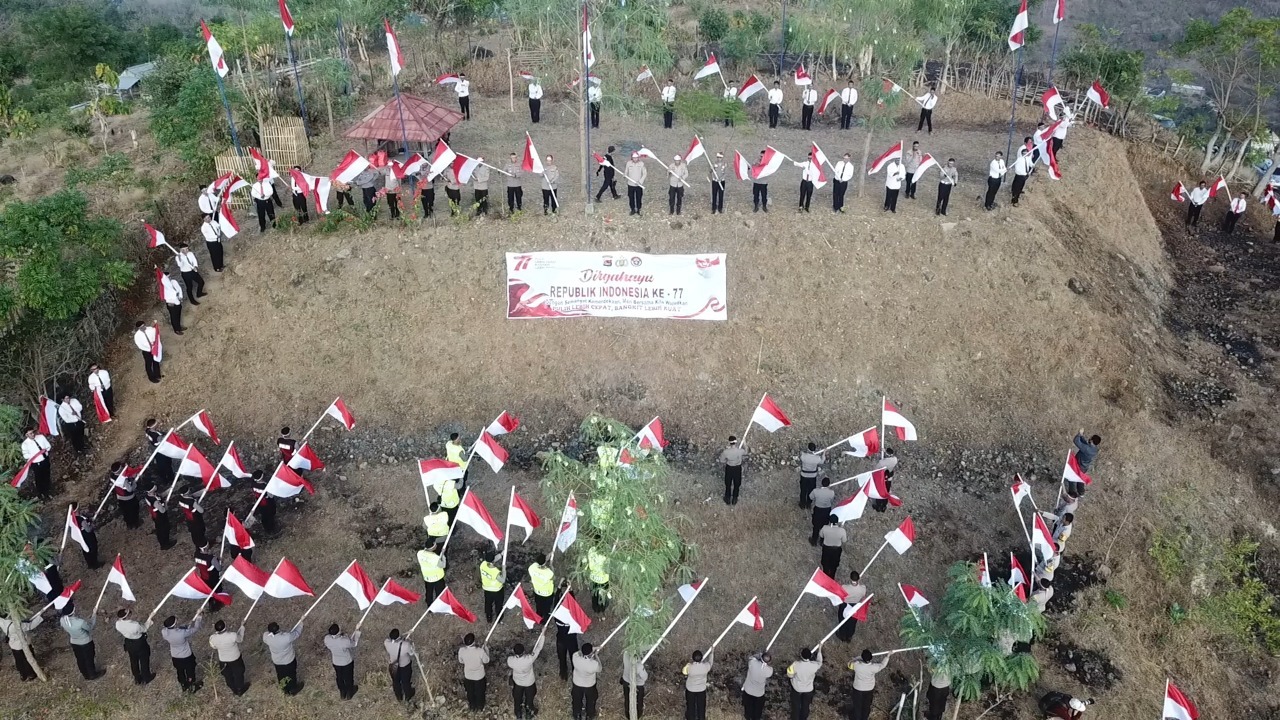 Formasi HUT RI Ke 77 dari para personil Polres Bima Kota menjadi bagian dari prosesi pengibaran Sang Merah Putih di puncak Jatiwangi Kota Bima.